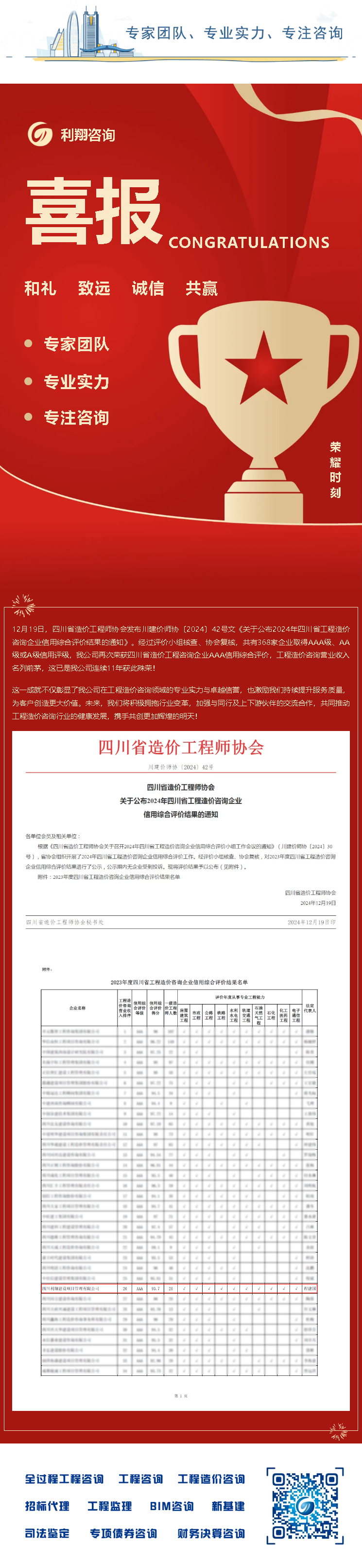'喜報 | 利翔咨詢連續(xù)11年榮獲四川省造價工程咨詢企業(yè)AAA信用綜合評價'