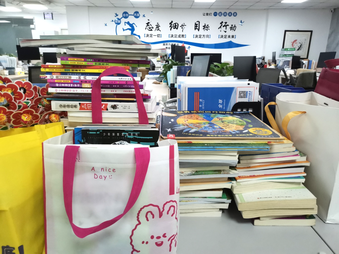 堆積如山的書本,滿載著利翔人對孩子們最好的關(guān)愛和支持。每一本書都將成為孩子們成長的階梯,每一份愛心都將化作他們心中的陽光。