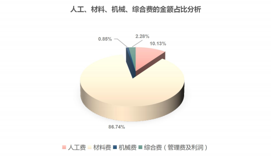 該幕墻光伏發(fā)電工程按照2023年成都市區(qū)的價(jià)格水平,以相應(yīng)時(shí)期的造價(jià)定額、相關(guān)標(biāo)準(zhǔn)及各項(xiàng)法規(guī),數(shù)據(jù)分析得出:人工費(fèi)占比10.13%,材料費(fèi)占比86.74%,機(jī)械費(fèi)占比0.85%,綜合費(fèi)(管理費(fèi)及利潤)占比2.28%。其中材料費(fèi)占比最大。