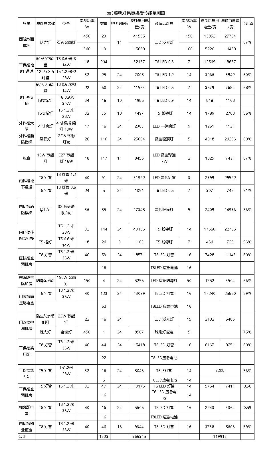 自2012年,醫(yī)院在門診樓地下車庫和公共區(qū)域更換了2309套LED燈具,實現(xiàn)50%的節(jié)電率,年節(jié)約15萬度電。隨后幾年,醫(yī)院在其他區(qū)域繼續(xù)更換LED燈具,節(jié)能率顯著提升,年節(jié)電量進一步增加至16萬度以上。2017年,更換1323支LED燈具,節(jié)能率達到67%,年節(jié)電24.64萬度。2018年,參與綠色照明補貼項目,更換T8日光燈,節(jié)電率達到57.72%,年節(jié)電122.2萬度。至2019年,醫(yī)院進一步在公共區(qū)域更換LED燈具,持續(xù)推動節(jié)能降耗。