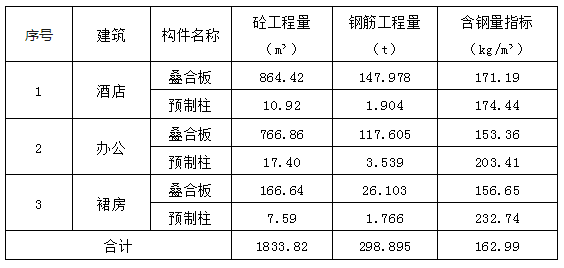 某項(xiàng)目現(xiàn)澆混凝土含鋼量指標(biāo)測(cè)算為155kg/m3,裝配式構(gòu)件含鋼量指標(biāo)為163kg/m3。